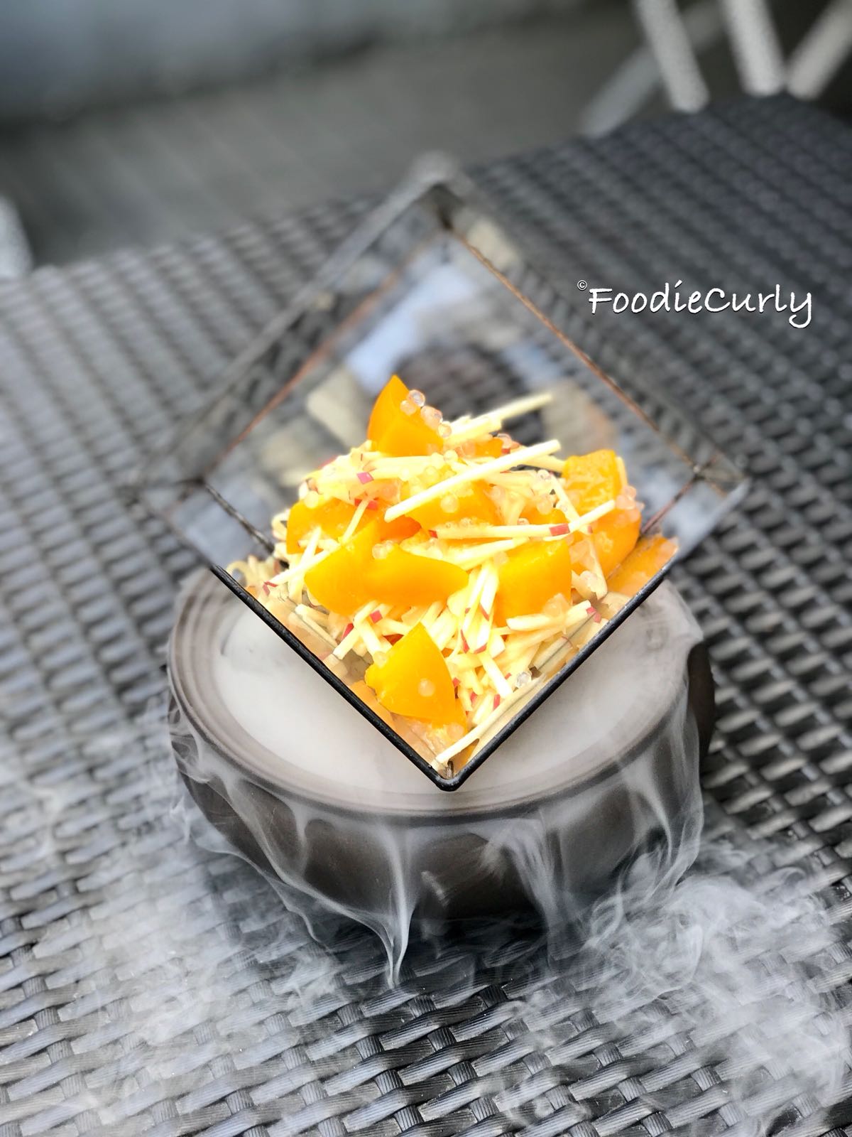 先來一個沙律做頭盤,今天我們有一位素食朋友,所以選了這個沙律 (走蟹籽)。蘋果新鮮爽口,香桃味道甜美,最重要是沙律底盤加了乾冰,冒著煙出場,充滿了仙氣,好呃like!