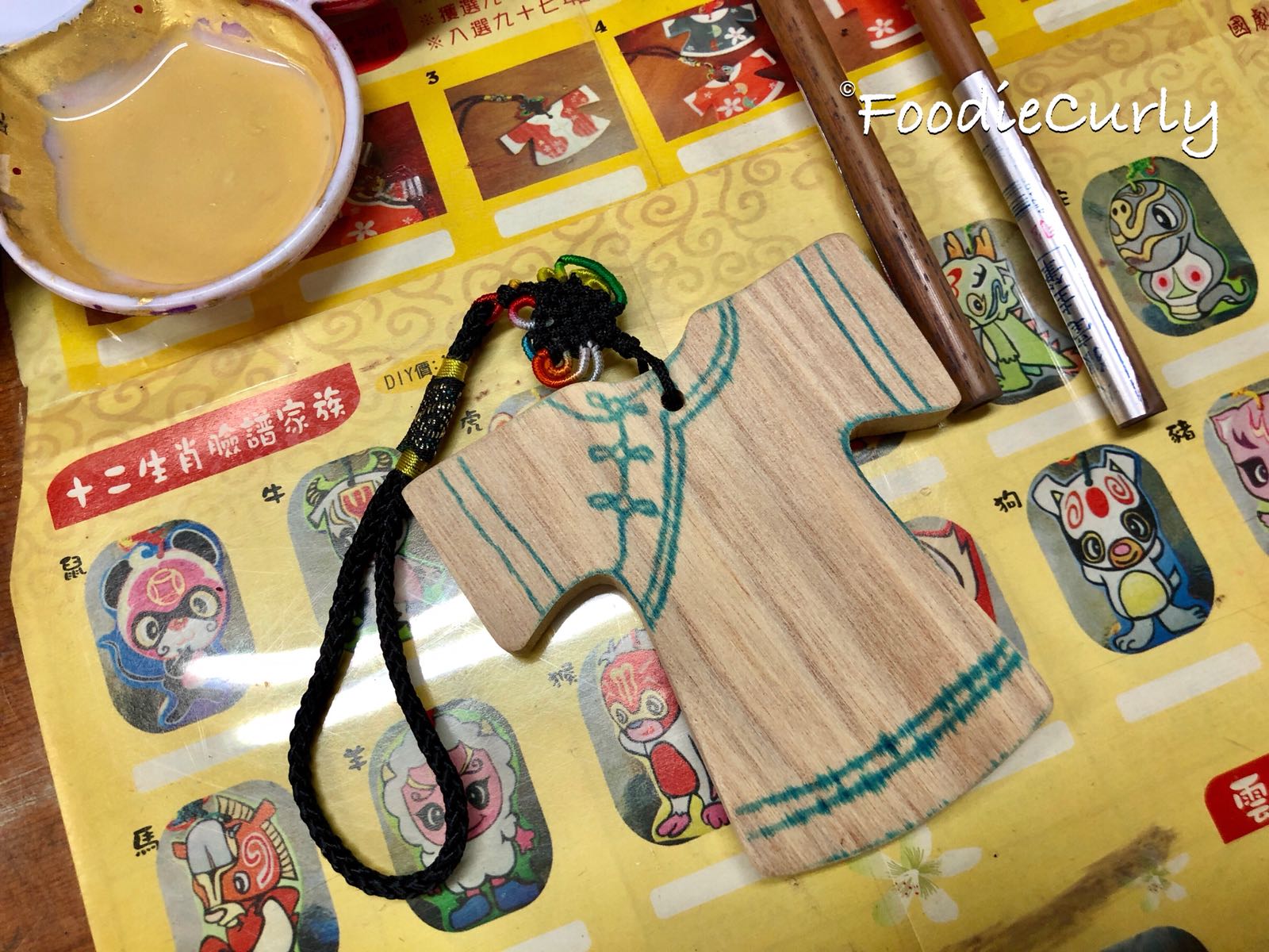 到埗後我們先DIY臉譜掛飾,我挑了最簡單的一款來做 — 華服,木板上已經有草稿,我們只需在上面填色就可以。
