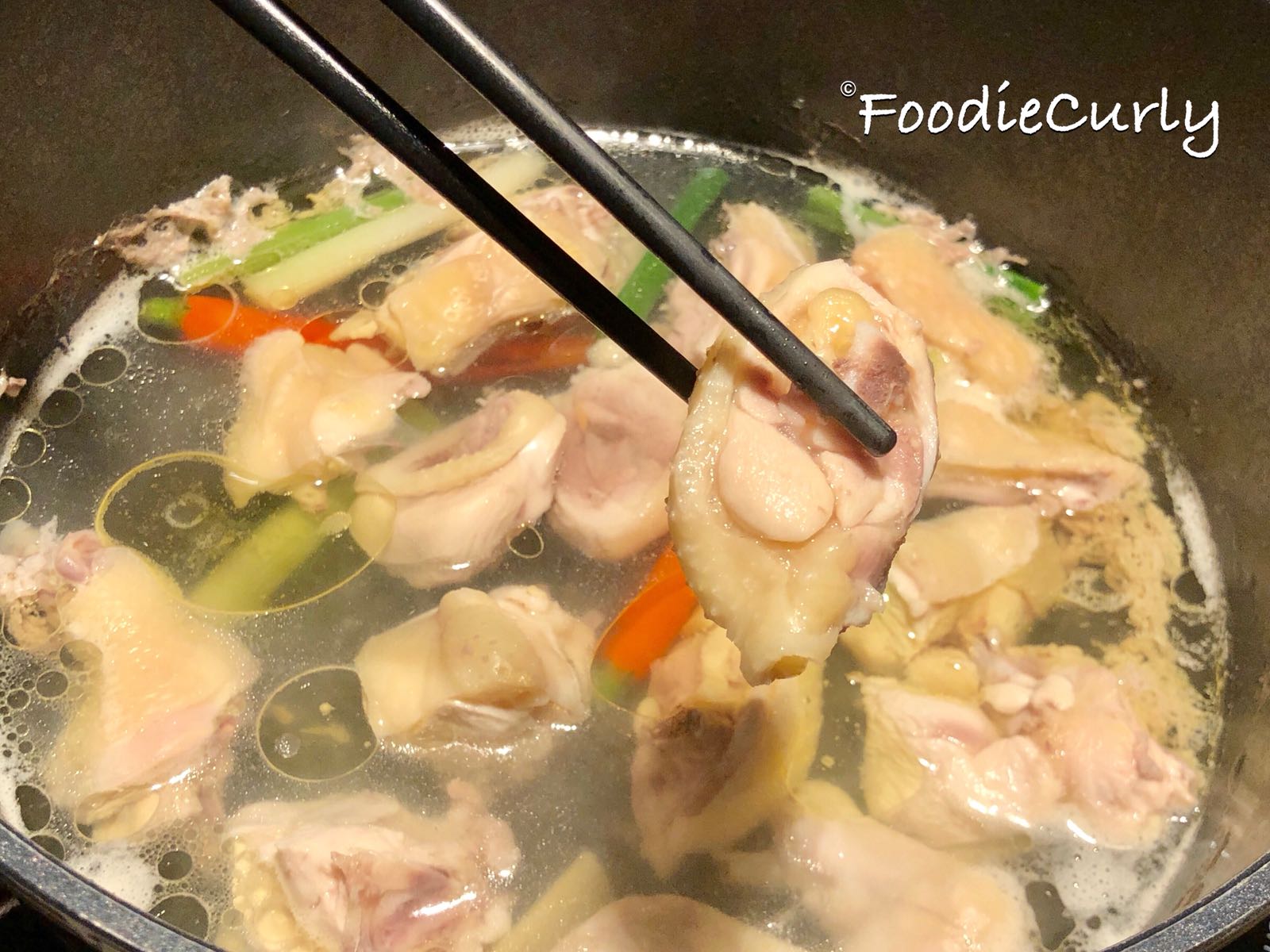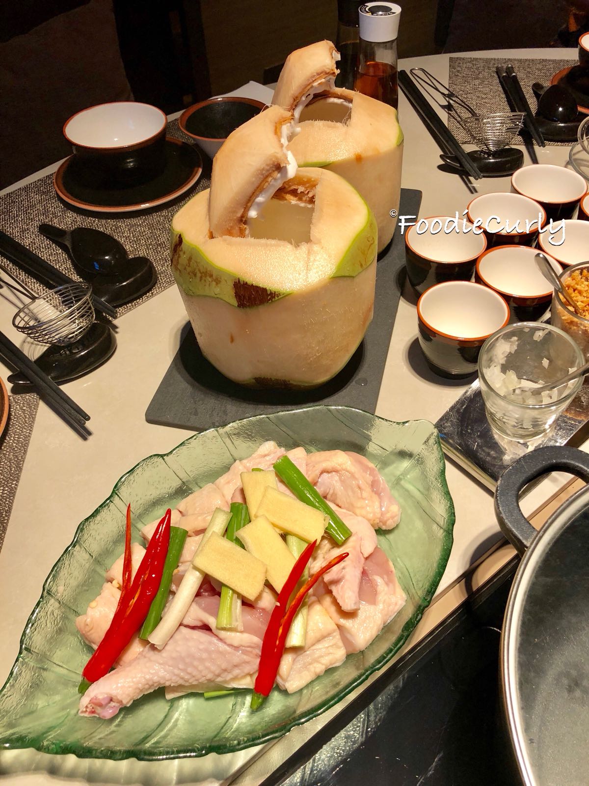 先喝湯底,椰青雞是在客人面前將嘉美雞及新鮮椰青水倒入鍋內即煮,嘗一口湯,想不到竟是甜中帶辣,原來湯底還有薑片和辣椒。