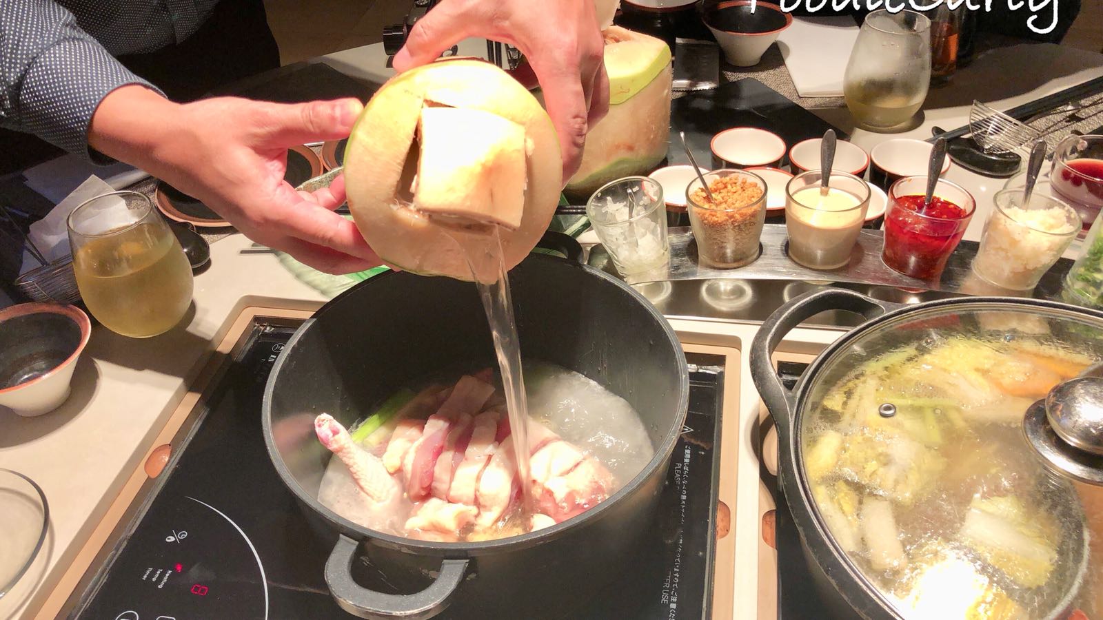 我們這晚人多,叫了兩個火鍋,一個是我最愛的椰青雞,另一個則是鴛鴦鍋,一邊是牛肋骨,一邊是招牌花膠響螺。