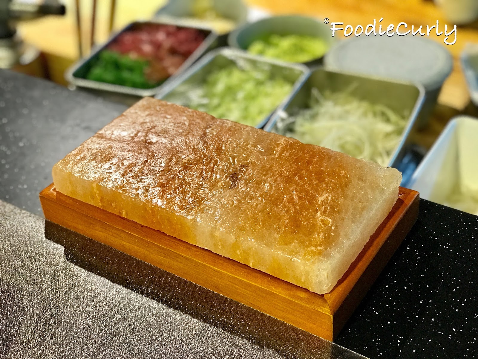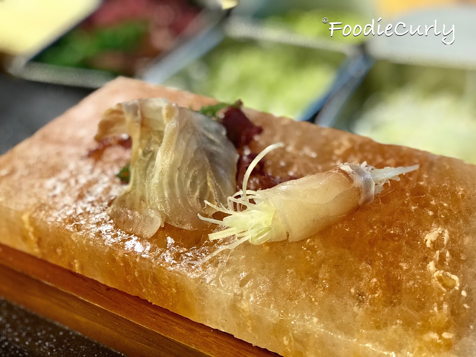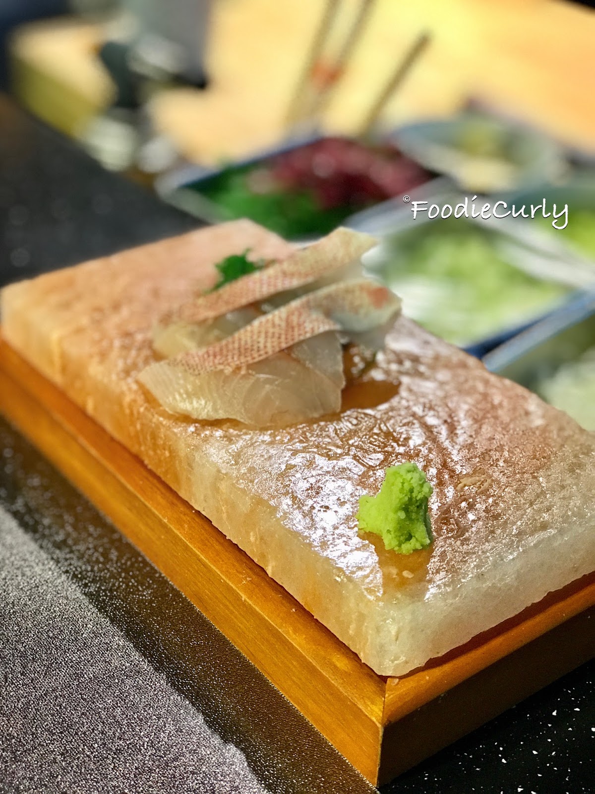 很多Omakase都以木板上桌,這裡的木板上卻還加了一塊很大的岩鹽,因為餐廳覺得刺身沾了岩鹽後更能突顯鮮味,不用再蘸醬油。