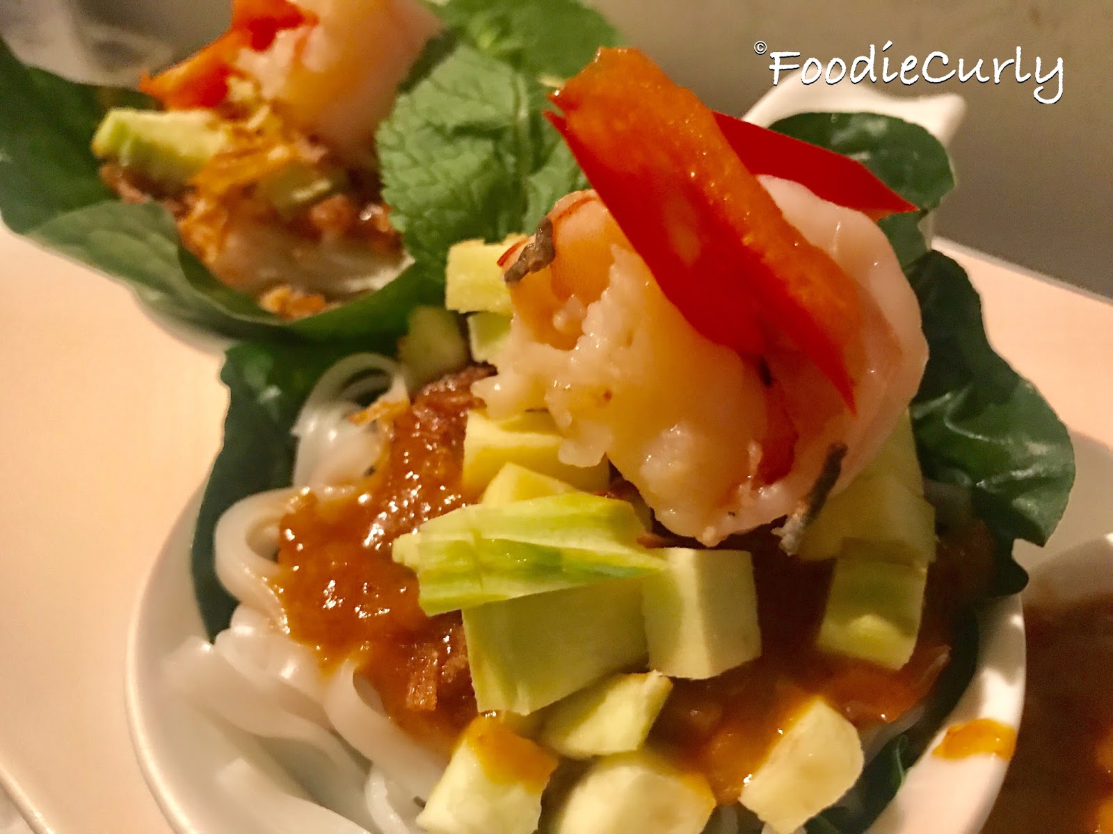 很精緻的四小碟,面頭是一粒粒的青芒果,爽口、微酸,接著是香口的炸蒜和新鮮大蝦,已經是很好的組合,沒想到底下是泰式麵條,添一些加了洋蔥的沙爹醬,太美味了,推介!