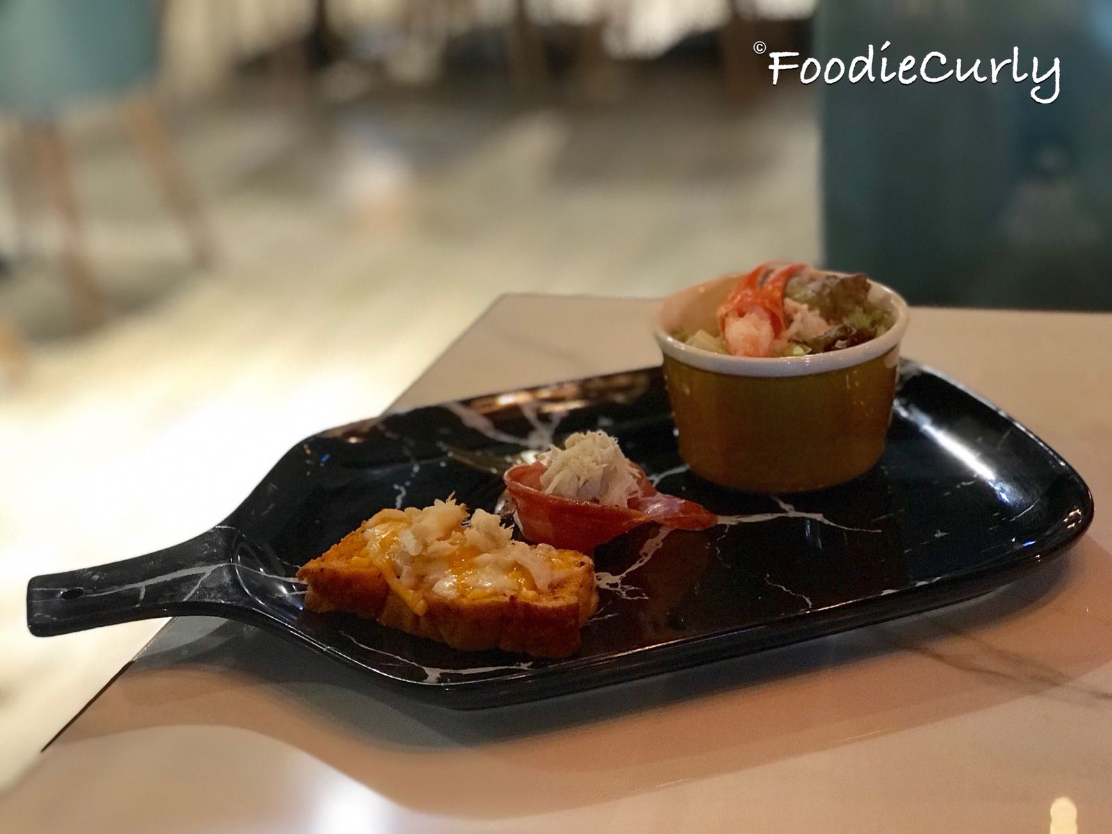共有三小件:芝士蟹肉多士、蟹肉巴馬火腿、及蟹鉗沙律。蟹一向是我的「飛佛」,沒理由不愛這一碟,尤其是蟹肉巴馬火腿,鮮味的蟹肉與鹹香的火腿,想不到是如此匹配。