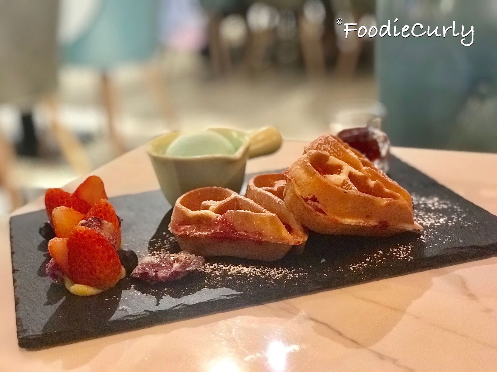 本以為會看到一朵朵的玫瑰,卻沒想到竟是以玫瑰花瓣入饌,玫瑰片加上了糖霜,吃起來很脆,不過有點太甜;窩夫熱辣辣,外脆內軟;還有一杯海鹽雪糕,少許鹹味,更多牛油味。