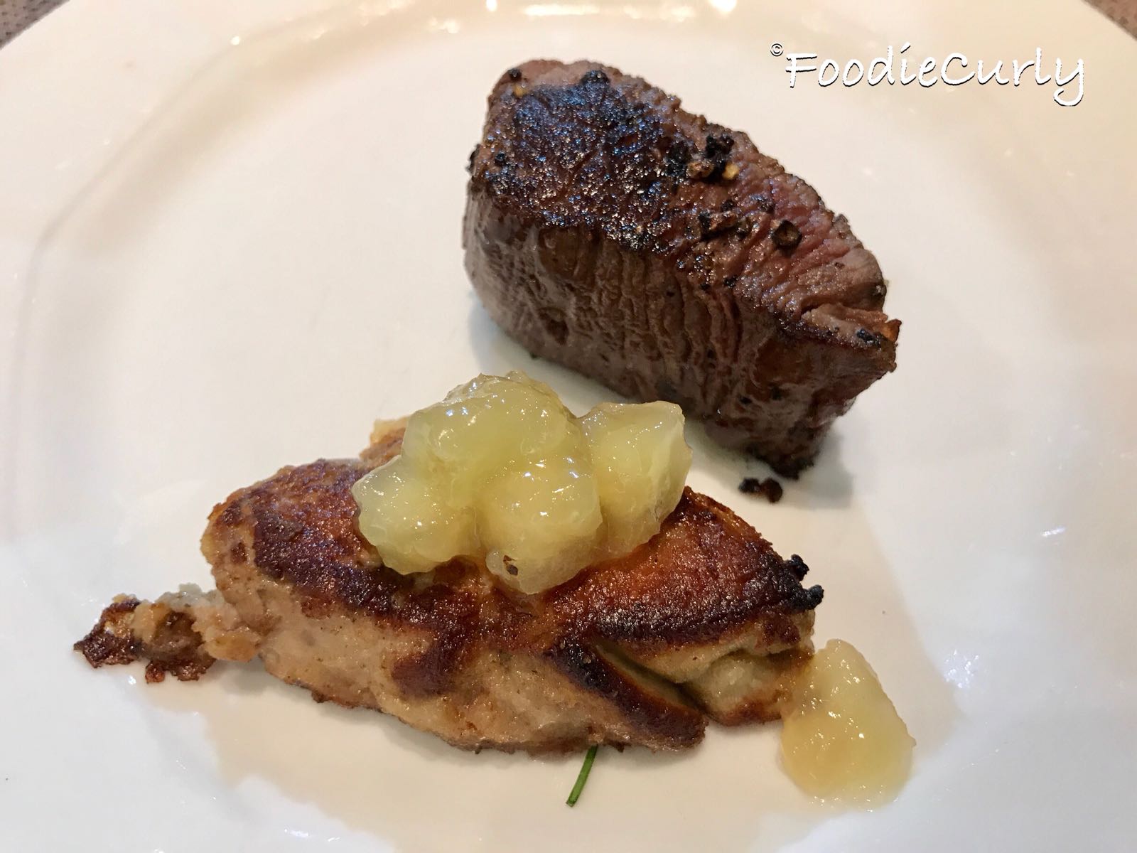 今晚的另一主角是頂級美國牛肉,而每枱客人,都會送上一碟香煎鴨肝拼牛柳,鴨肝軟滑、油份充足;牛肉火候控制得好,肉質軟嫰、肉味濃郁。