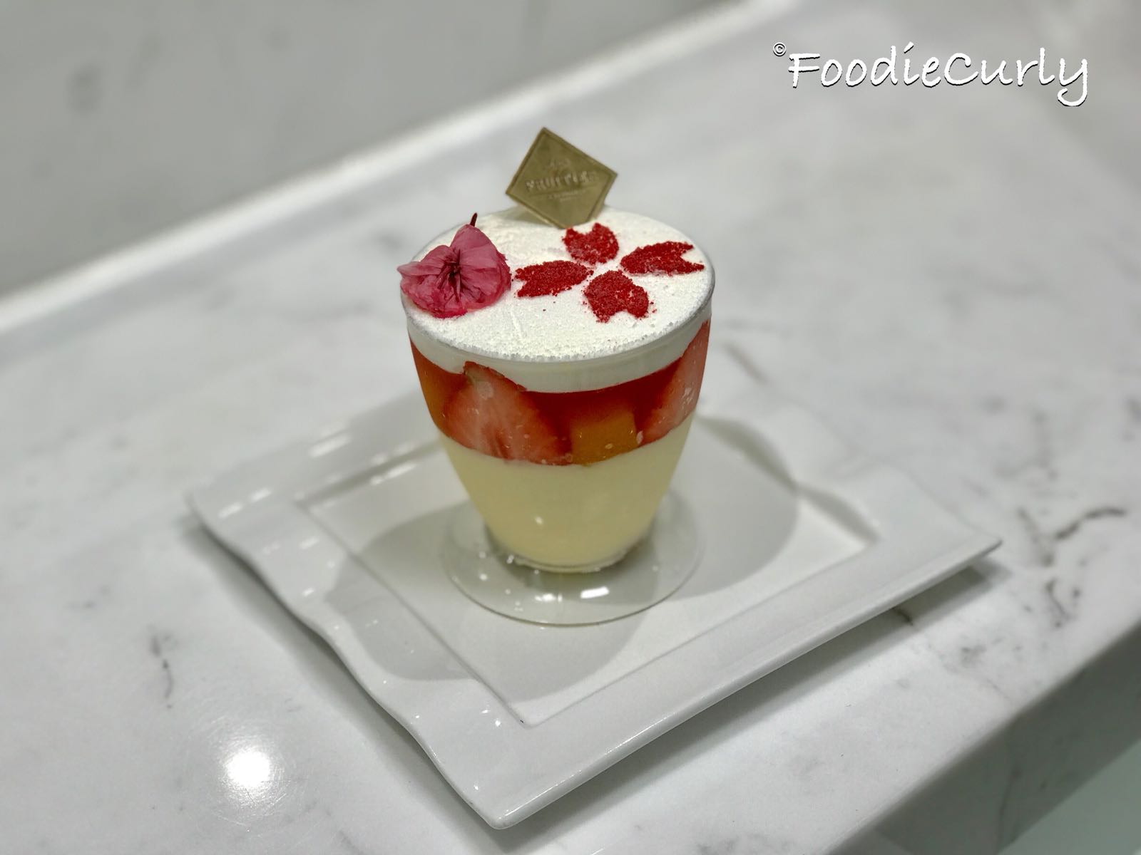 我們這些「新X坑」,是衝著三款日本櫻花甜品而來的,當然要三款都試過!這一款的底層是芝士慕絲,細膩而軟滑,上面則是福岡甜王士多啤梨啫喱,清甜味美。不得不讚的是面頭用梅粉做出來的櫻花圖案,令這杯甜品倍添可愛。