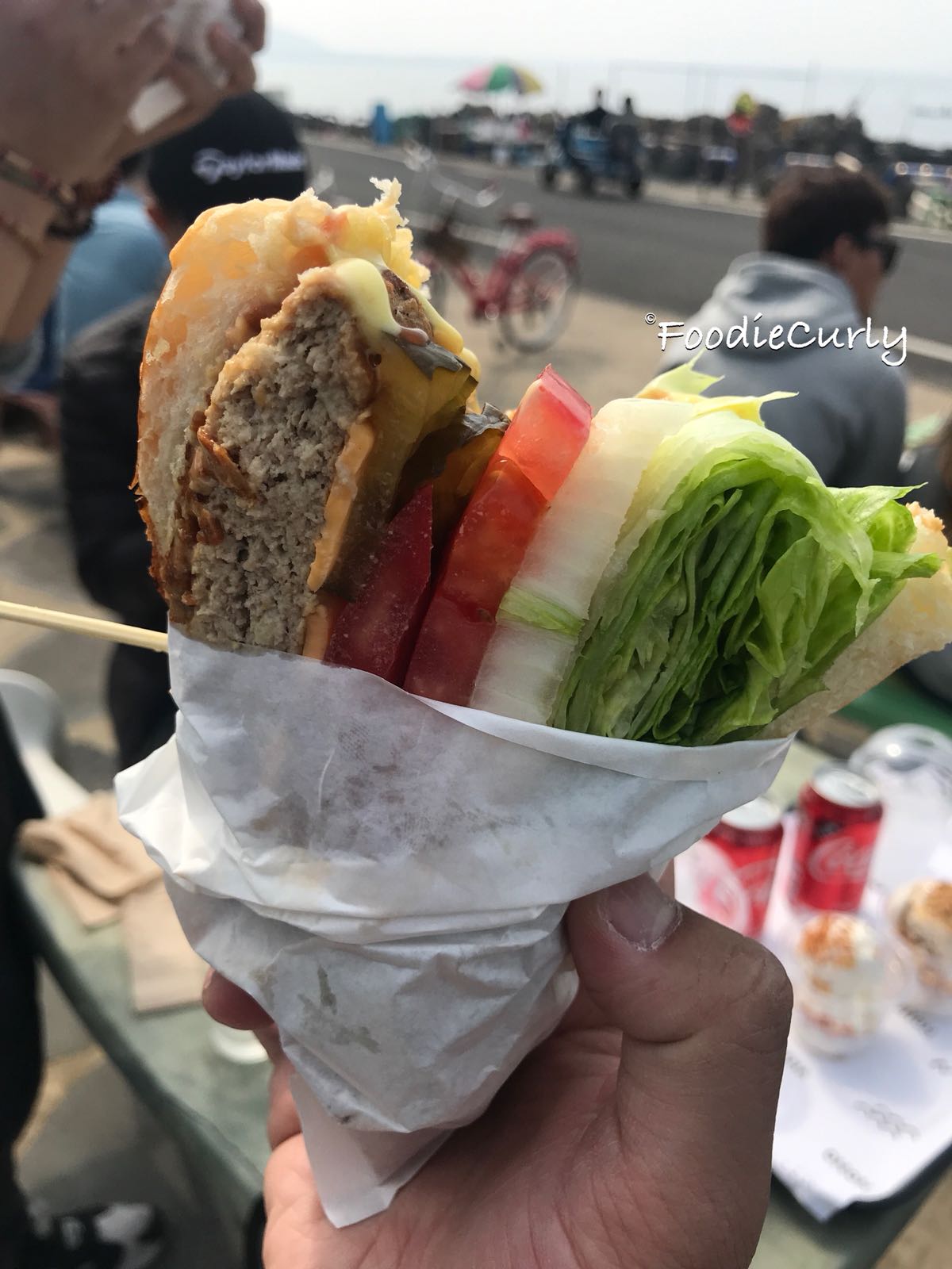 果然是名不虛傳呢!漢堡很有「高度」,除了厚厚的黑豚肉之外,還有芝士、酸瓜、番茄、洋蔥和生菜。吃之前,會有位oppa走出來,細心地幫你將漢堡壓扁,然後切半,再放入餐廳特製的紙袋內,讓你吃得更方便 (但還是別奢望可以一口咬到全部材料)。