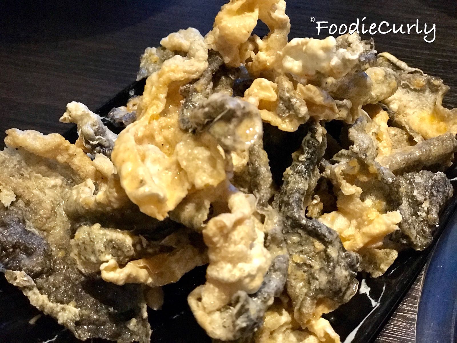 以上兩樣可以是火鍋料,也可以即食,因為都是即炸的,上桌時還是熱辣辣、脆卜卜。響鈴裡面包著紫菜和鹹蛋黃,更添香氣;炸魚皮也是用鹹蛋黃炒的,甘香酥脆,點一碟「齋啪」都可以!