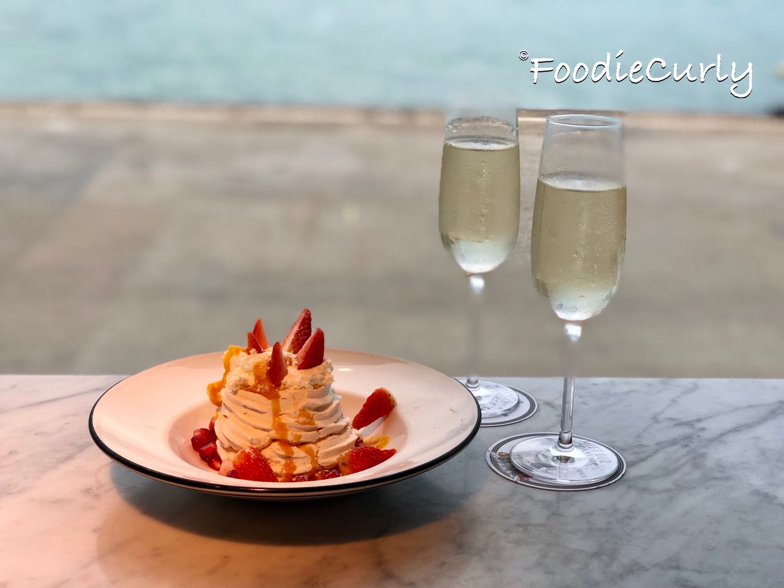 這個甜品遠看是忌廉,但只要用叉子一戳,就會發現這是脆卜卜的蛋白餅。蛋白餅用蛋白和砂糖製成,裡面有流心檸檬醬,一甜一酸消減了甜膩感,再加上兩杯氣酒,令我們這個下午過得分外寫意!