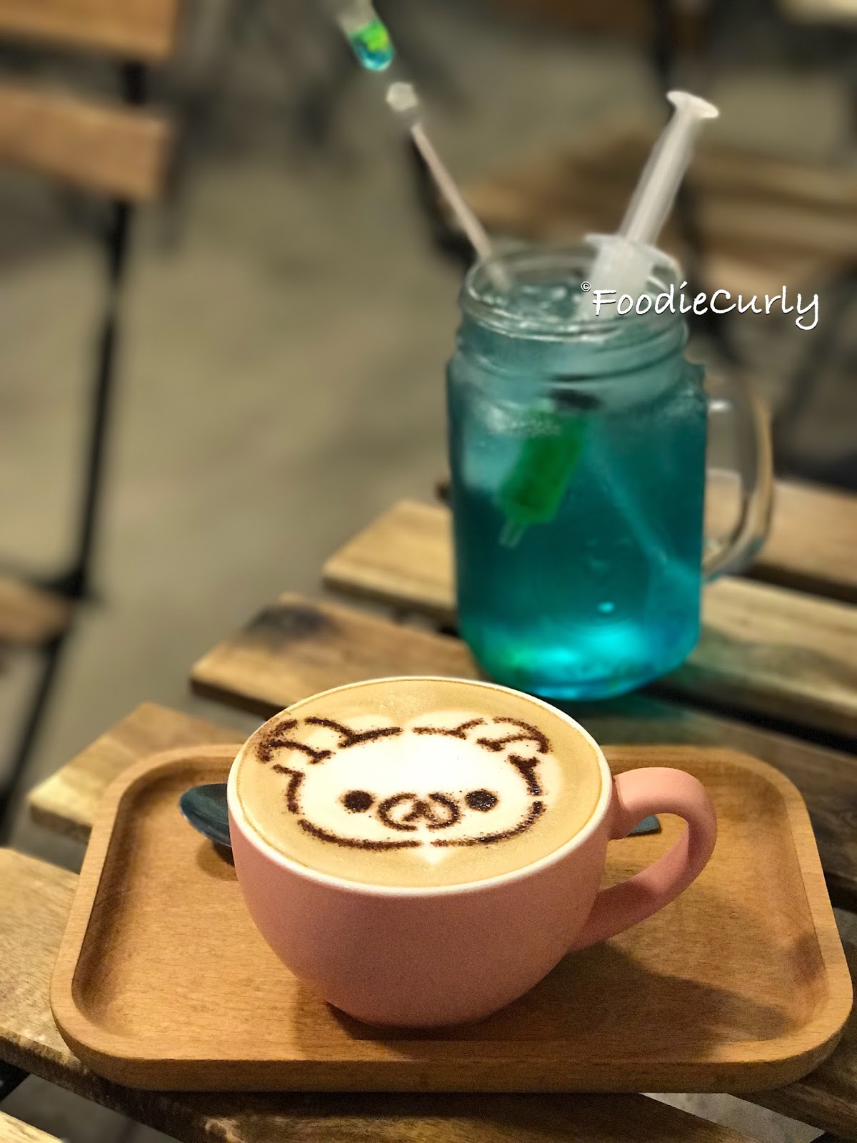 Latte造型非常可愛,是鬆弛熊呀!忍痛喝一口,順滑,不錯;阿凡達是甚麼?原來是用藍柑橘糖漿溝梳打,針筒內的是青蘋果糖漿,打進去,再搞勻,味道很清新,不會過甜。