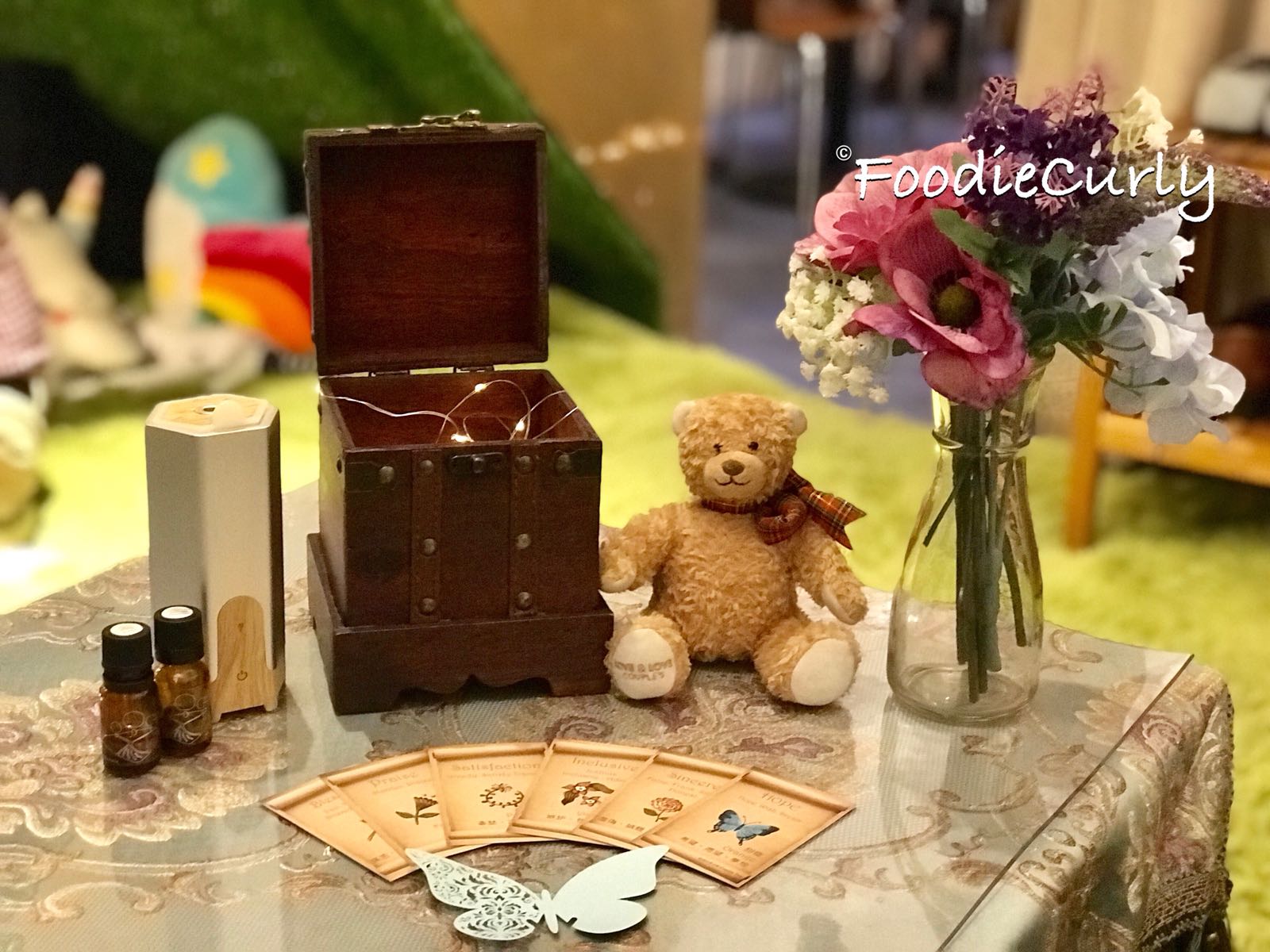 點了下午茶後,店員會讓你抽卡片,並將對應的精油倒進香薰機內,讓你提升能量,之後會給你一張蝴蝶紙仔,讓你寫下希望,掛在餐廳,寓意無論大家遇到了甚麼困難,都要記著自己的目標,擁抱希望。