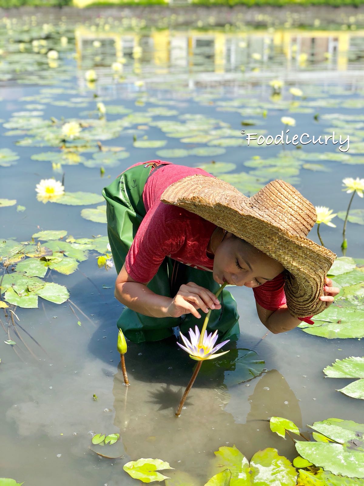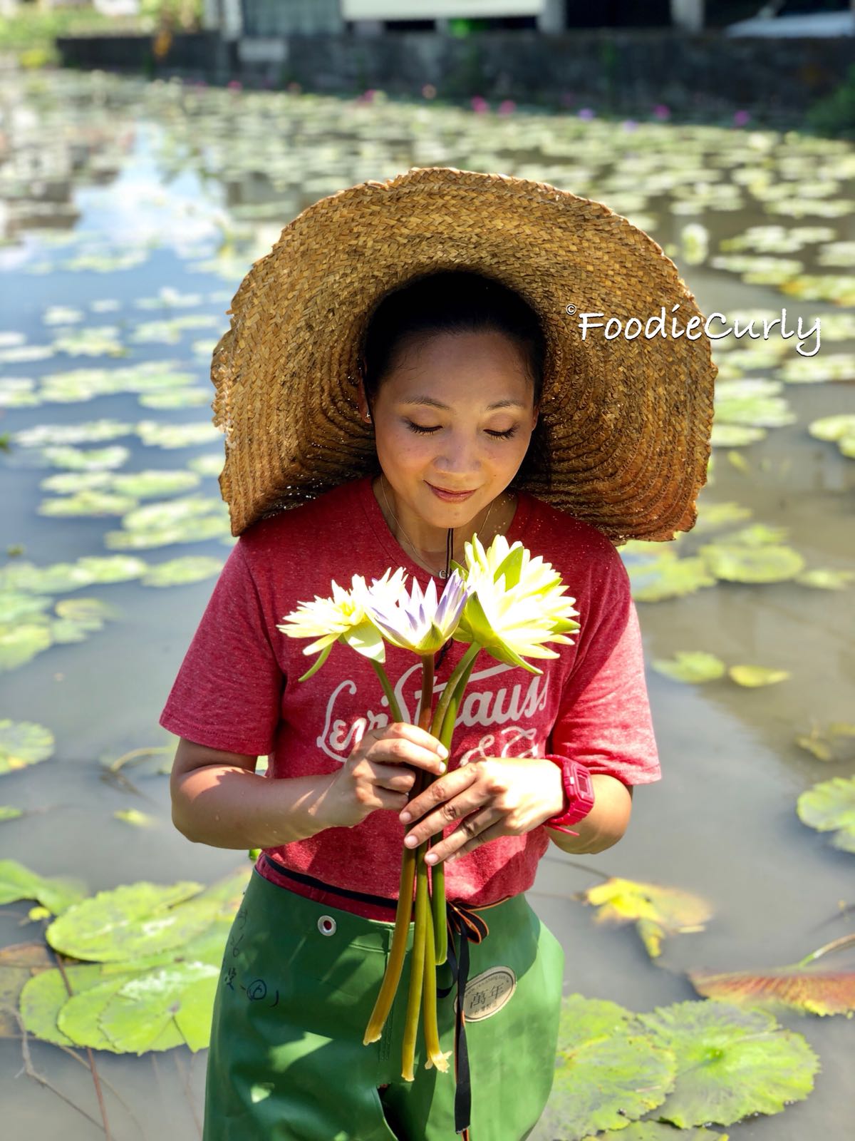 之後李先生再教我摘蓮花的方法:用指甲掐一下,再轉一轉就可以了,雖然沒李先生摘的那麼漂亮,但總算成功,我們就帶著這些不同顏色的蓮花,等一下帶回民宿泡茶。