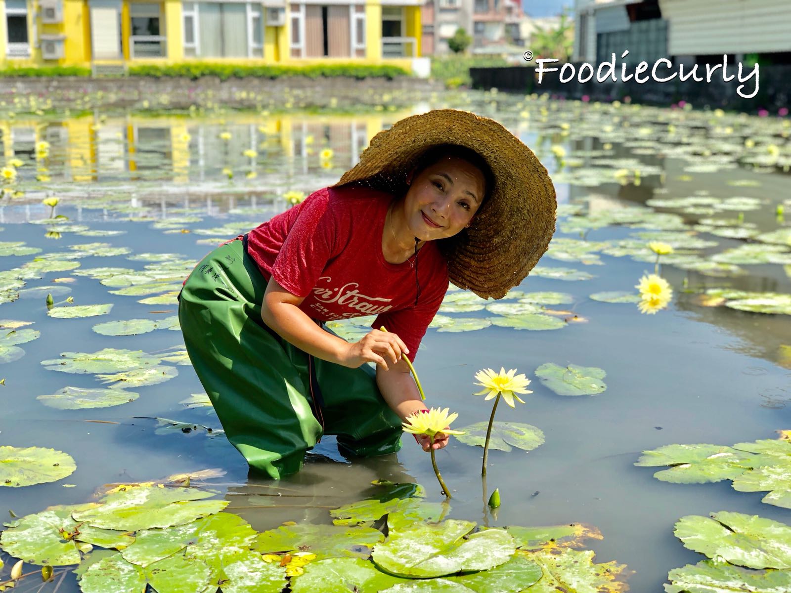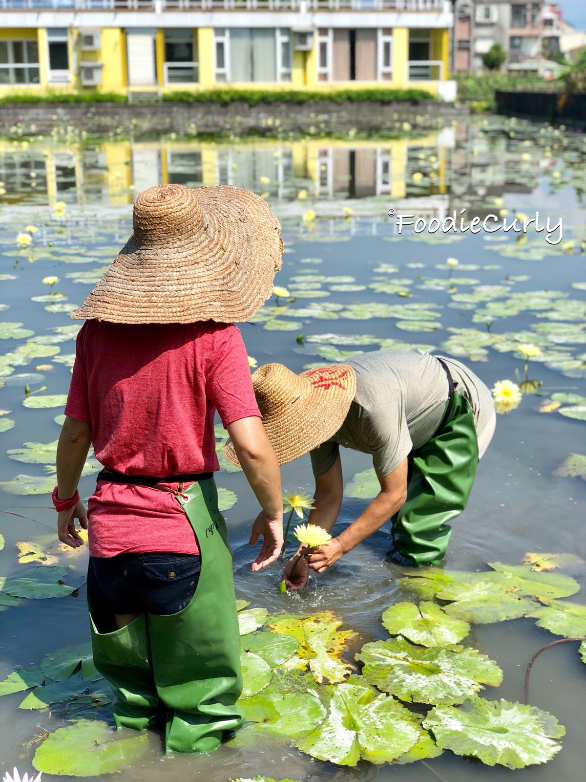 我們走了約五分鐘 (不是民宿門口的蓮花池,是另一個),就到達目的地了。池水不深,約到我的小腿,穿了防水褲,不怕濕水,不過裡面全部是泥巴,舉步維艱,不想趴進池裡吃泥的話,必須用腳尖插進泥巴,再小心的抽出來,否則泥巴會把你雙腳吸著,很容易失平衡。
