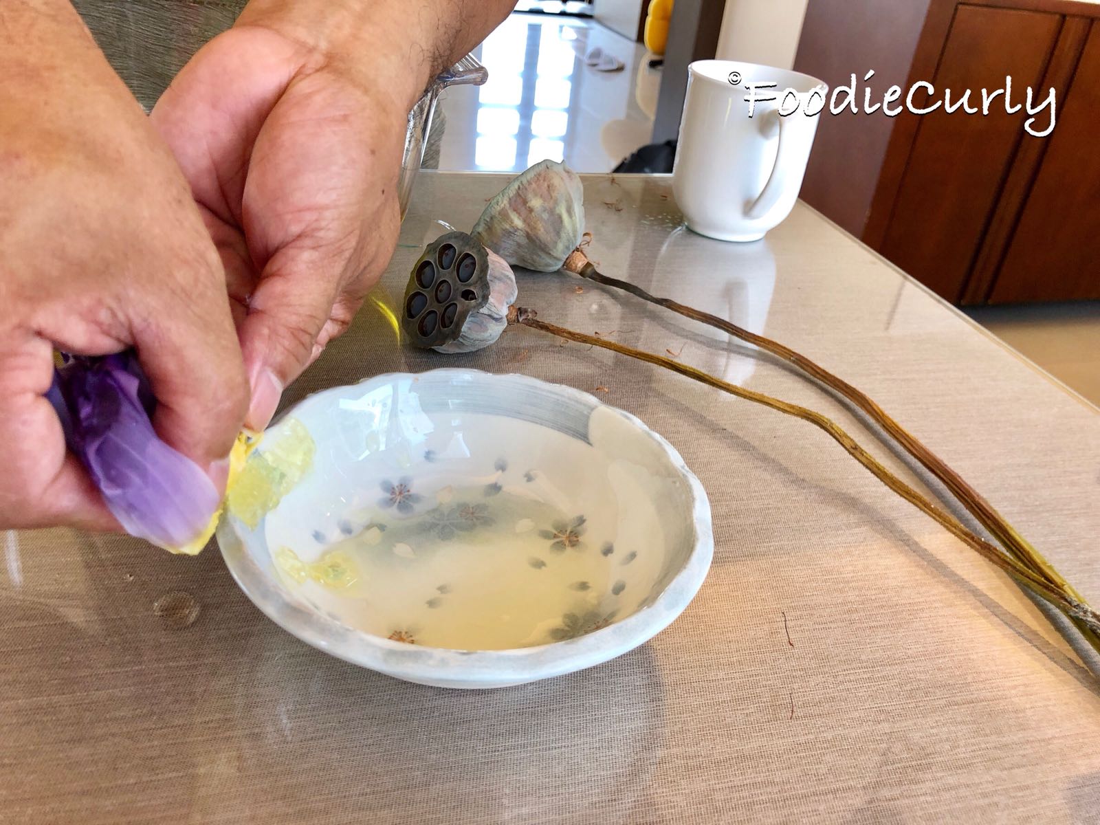 帶著我們的戰利品,就回到民宿了。只見李先生將新鮮的蓮花洗淨,切去不要的部分,然後就放進玻璃盆裡加入熱水泡,完全無添加,新鮮又天然。