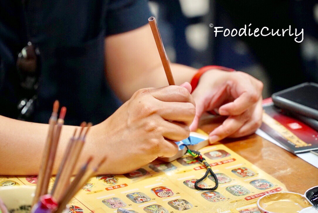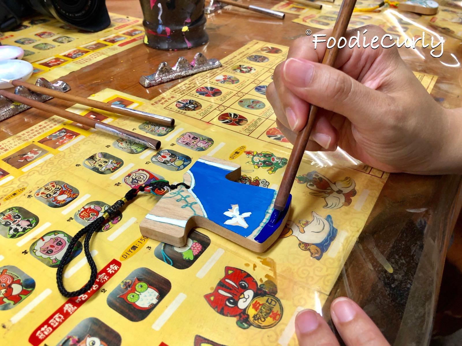 到埗後我們先DIY臉譜掛飾,我挑了最簡單的一款來做 — 華服,木板上已經有草稿,我們只需在上面填色就可以。