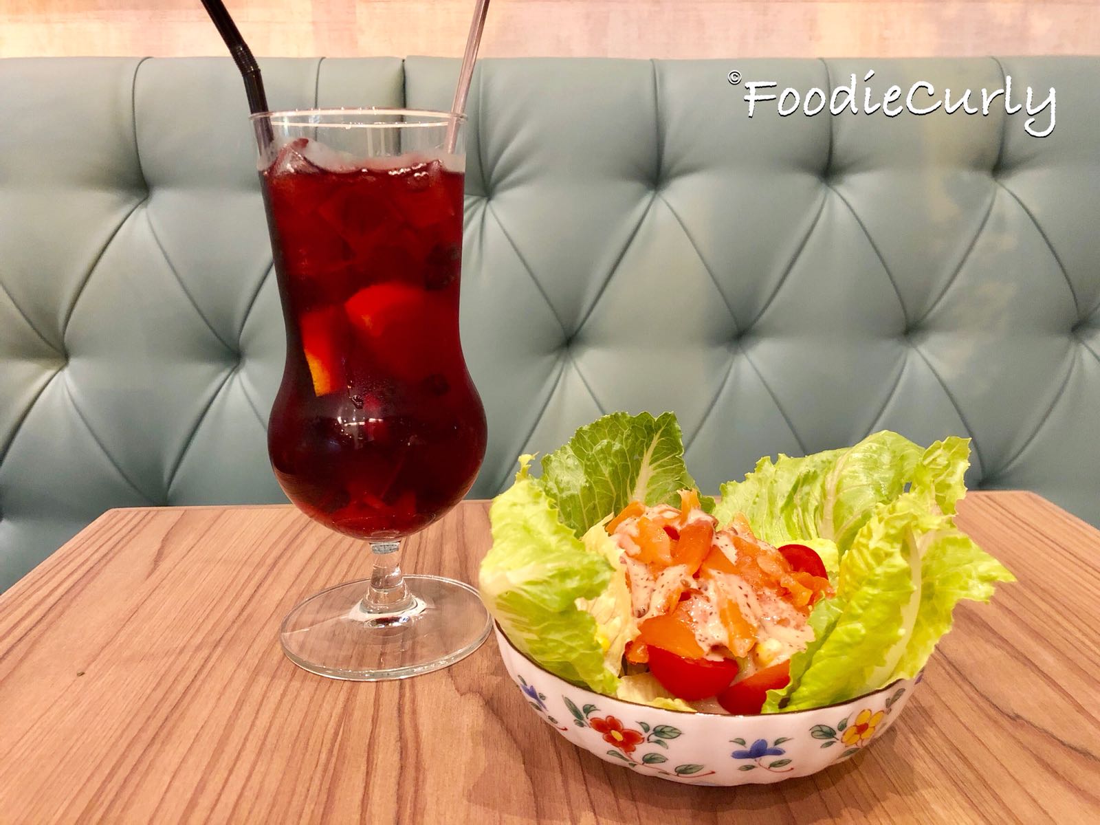 飲品是凍雜莓水果茶,裡面有新鮮藍莓和草莓,加了檸檬,味道不會過甜,好健康呢!煙三文魚沙律配上了日式麻醬,三文魚新鮮,醬料清新,都不錯。