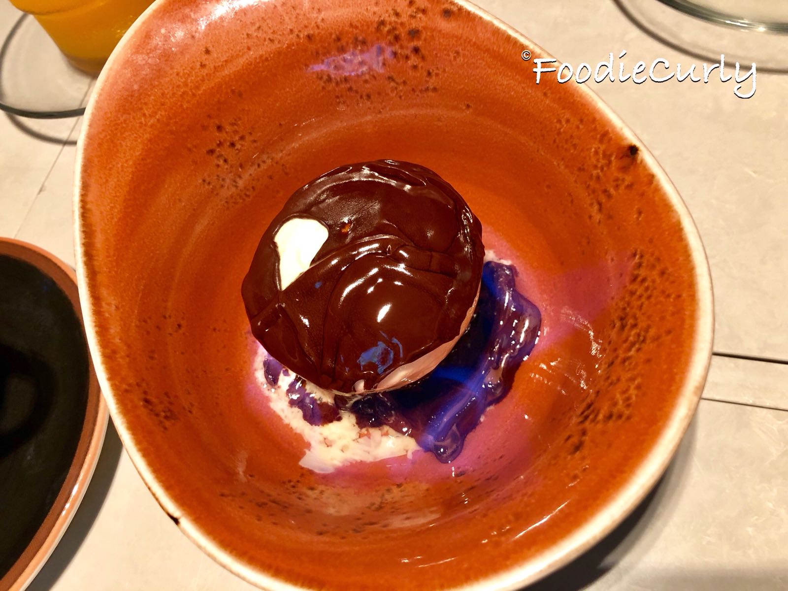 座上有位甜品控,她看見這堆甜品立即瘋了,開心得狂拍照。火鍋店能提供這麼多西式甜品選擇,確實也令我有點意外。我最喜歡的是火焰香橙朱古力波,店長在湯勺上加了酒,點火,再繞在朱古力波上,朱古力波隨即溶化,裡面是凍冰冰的雪糕,冰火感覺好過癮!