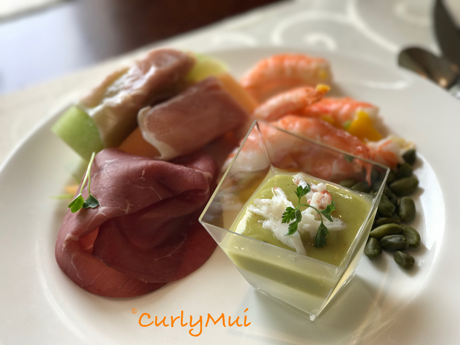 我尤其喜歡吃這裡的鮮蝦,已經剝殼,每隻都又大又鮮甜,每次都要吃十多廿隻才會收手!今天的凍湯是蟹肉開心果,略帶酸味,底部是啫喱,少飲凍湯,感覺特別;當然別忘記巴拿馬火腿+蜜瓜/哈密瓜,鹹香與水果甜味是絕配。