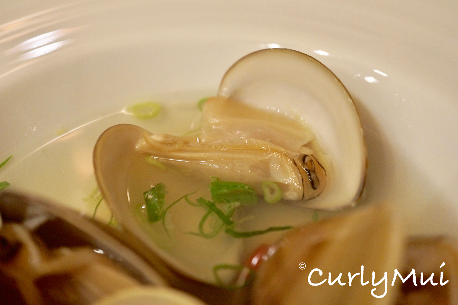 師傅先在煲內加入清酒、點火,熊熊烈焰相當壯觀,之後佢將大蜆放入去煮,每一隻剛打開,佢就即刻夾起,確保每隻蜆都係咁鮮嫰。湯底加入左昆布同辣椒,味道偏辣,非常刺激!