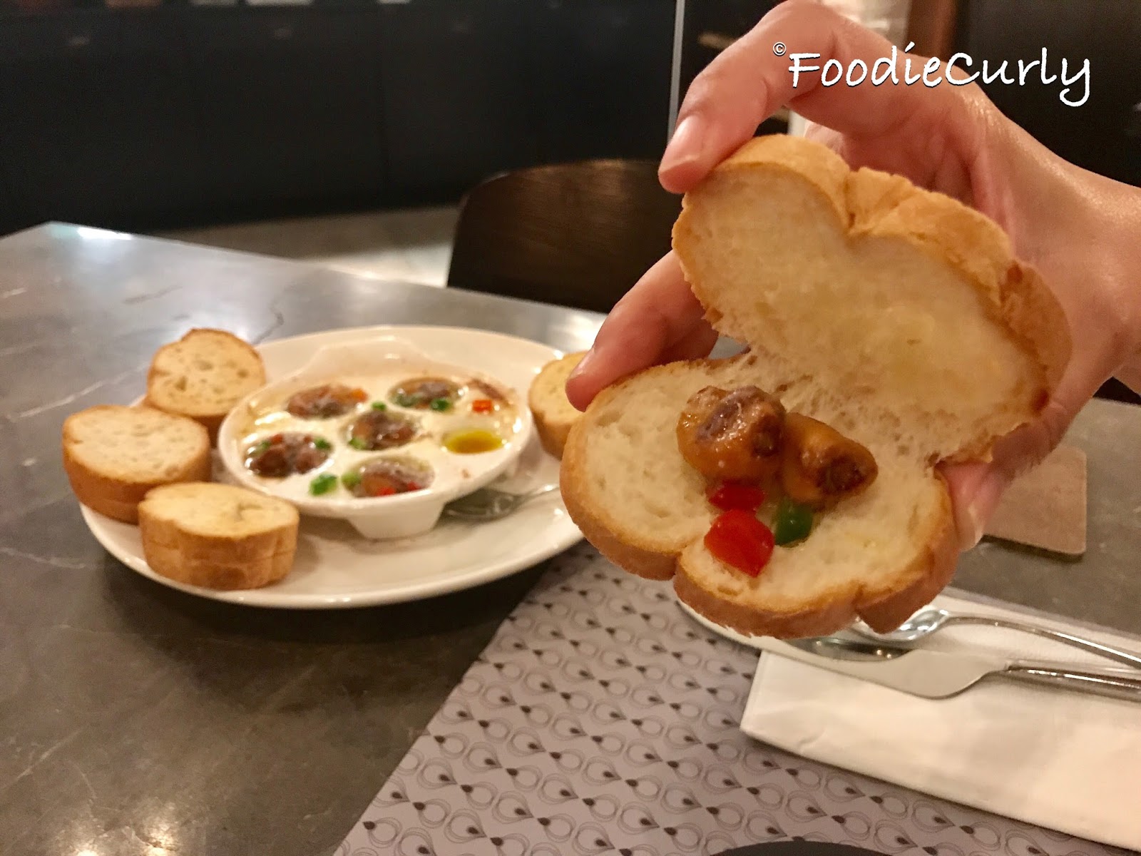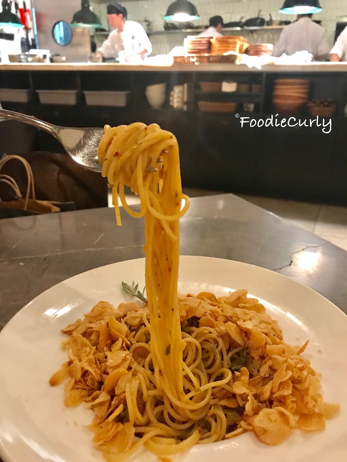 這個意粉真的不容小覷,因為它是用墨西哥辣椒炒的,在餐牌上標明了有「三隻辣椒」,點餐時沒有留意,來到才知道大件事!意粉上桌很有效果,面頭全是炸蒜片,用勺子撥開,吃一口意粉,立即噴火!辣椒好香,蒜片也是,這是一道很惹味的意粉⋯⋯如果你受得了那辣度!