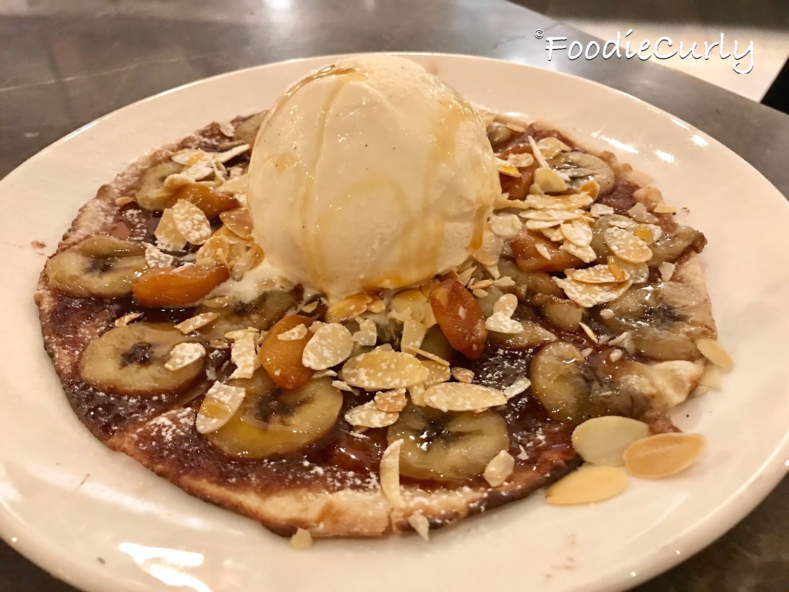 甜薄餅,上面塗滿了榛子醬,再加上香蕉片、甜蒜頭和自家製雲呢拿雪糕,再灑上果仁碎,榛子醬和香蕉從來都是絕配,加了甜蒜更感特別,吃得來有點像吃crepe,還要是8″大,可以和好友一同分享。