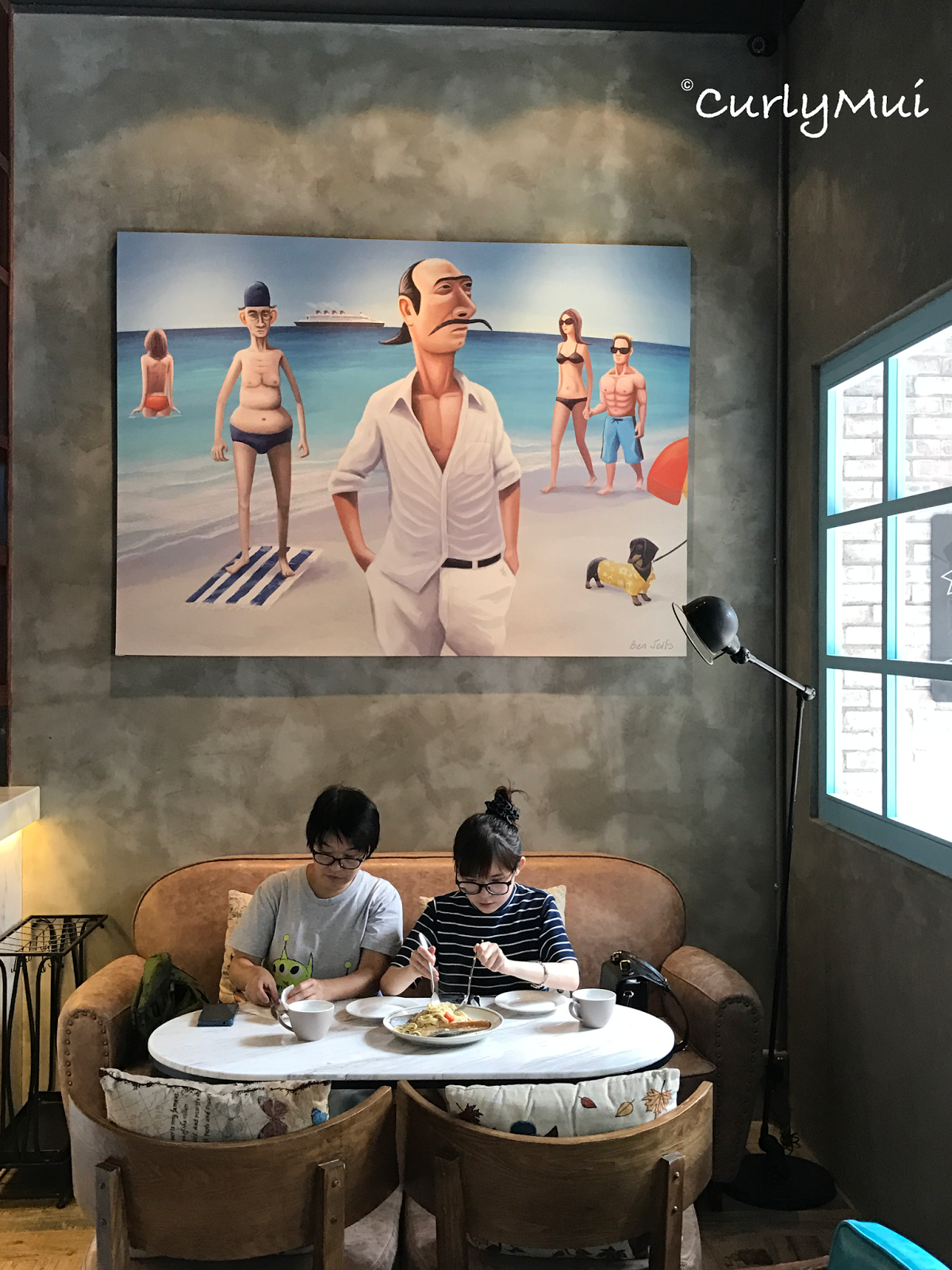 成間餐廳以海藍同淺灰色為主調,感覺好柔和舒服;牆上既壁畫同menu圖案一致,屬餐廳獨有特色。