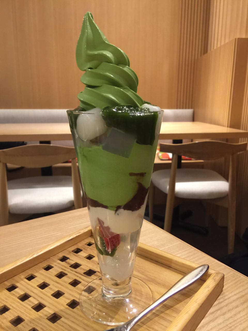香港限定芭菲($98),材料非常豐富:抹茶雪糕、抹茶蕨餅、糯米丸子、蛋糕、啫喱、紅豆、忌廉、士多啤梨……可以一次過滿足好多個願望!抹茶雪糕香滑,抹茶味濃,有奶香! 抹茶蕨餅有D似蒟蒻,清淡既抹茶味,完全係另一種口感; 糯米丸子軟綿綿夠煙靭;士多啤梨有少少果Jam Feel,好幸福既甜味,整體上感覺好好。