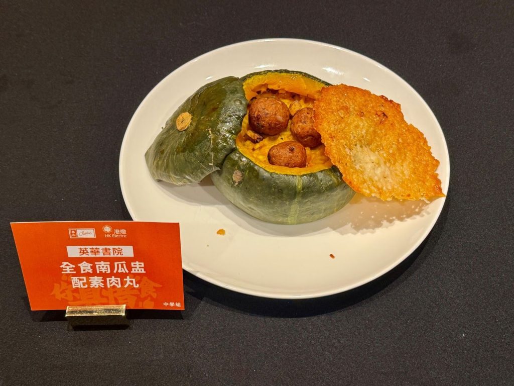 阿希在2024至2025學年的「心繫家國」中華飲食文化週暨學生廚藝大賽勇奪優異獎,故此聽到老師介紹美心與港燈「你真惜食!」x「綠得開心計劃」創意料理比賽之後,馬上躍躍欲試,參賽作品「全食南瓜盅配素肉丸」靈感源自他拿手的法國菜。南瓜燴飯運用廚房日常「食之無味、棄之可惜」的蔬果廢料,例如蘿蔔皮、洋蔥皮、西芹葉、椰菜花莖等,取其精粹成為蔬菜高湯,融入南瓜燴飯之中,而多餘的高湯更可運用於日常烹飪;而素肉丸則貫徹低碳理念,「素肉丸都是自家製作,材料包括豆腐渣、冬菇、麵包糠和榛子醬等等」,鮮味滿滿,重塑了肉丸的香氣和味道。