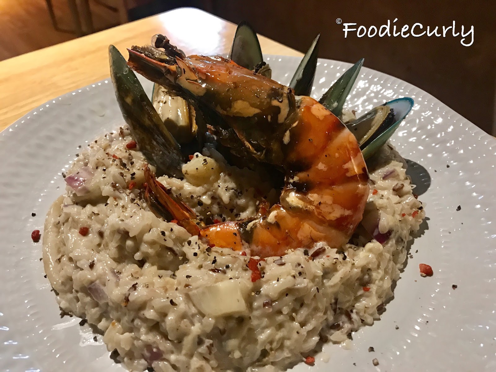 沒有令我反感的奶羶,反而是一陣海鮮鮮香,也許是鯷魚的神奇力量吧!飯內有洋蔥、脆煙肉粒,還有帶子、魷魚和蜆肉等,啖啖鮮味,很好吃!甚至,我愛這個飯多於面頭的大蝦和青口,很誇張吧!