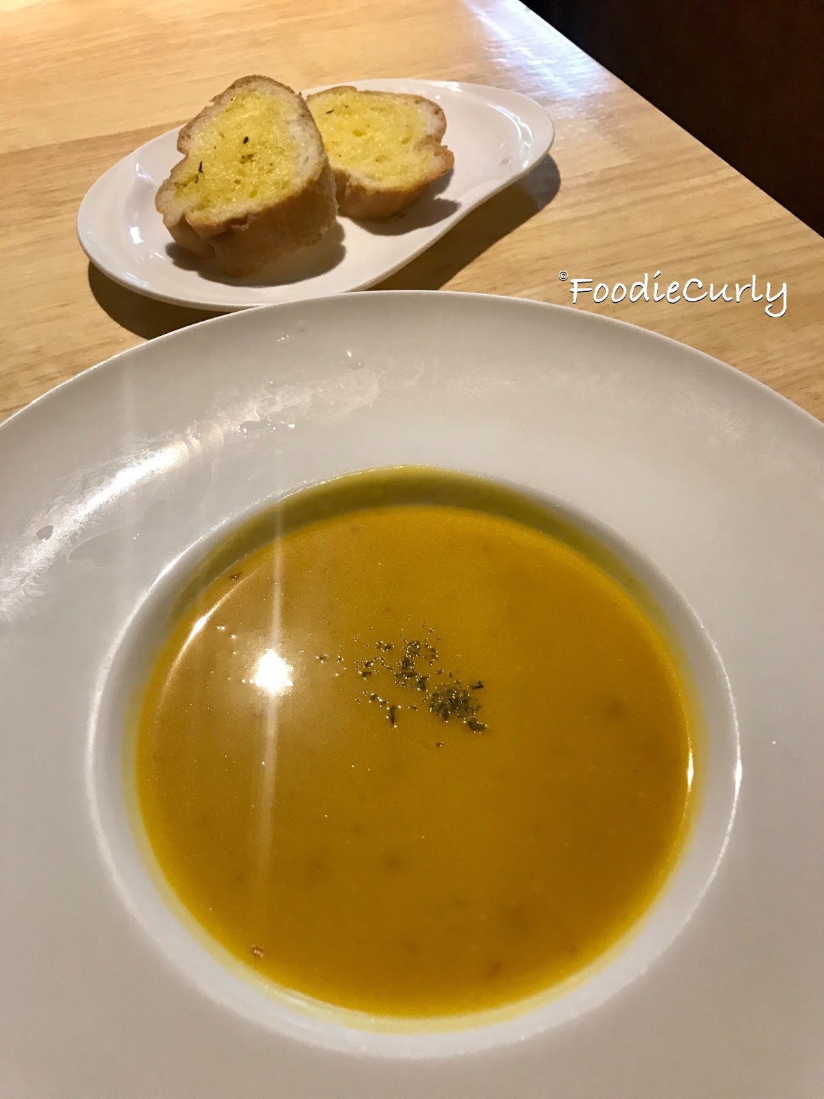 今晚的餐湯是南瓜湯,沒有過分creamy,反而是香甜的南瓜味,不俗;蒜蓉多士也夠香脆。