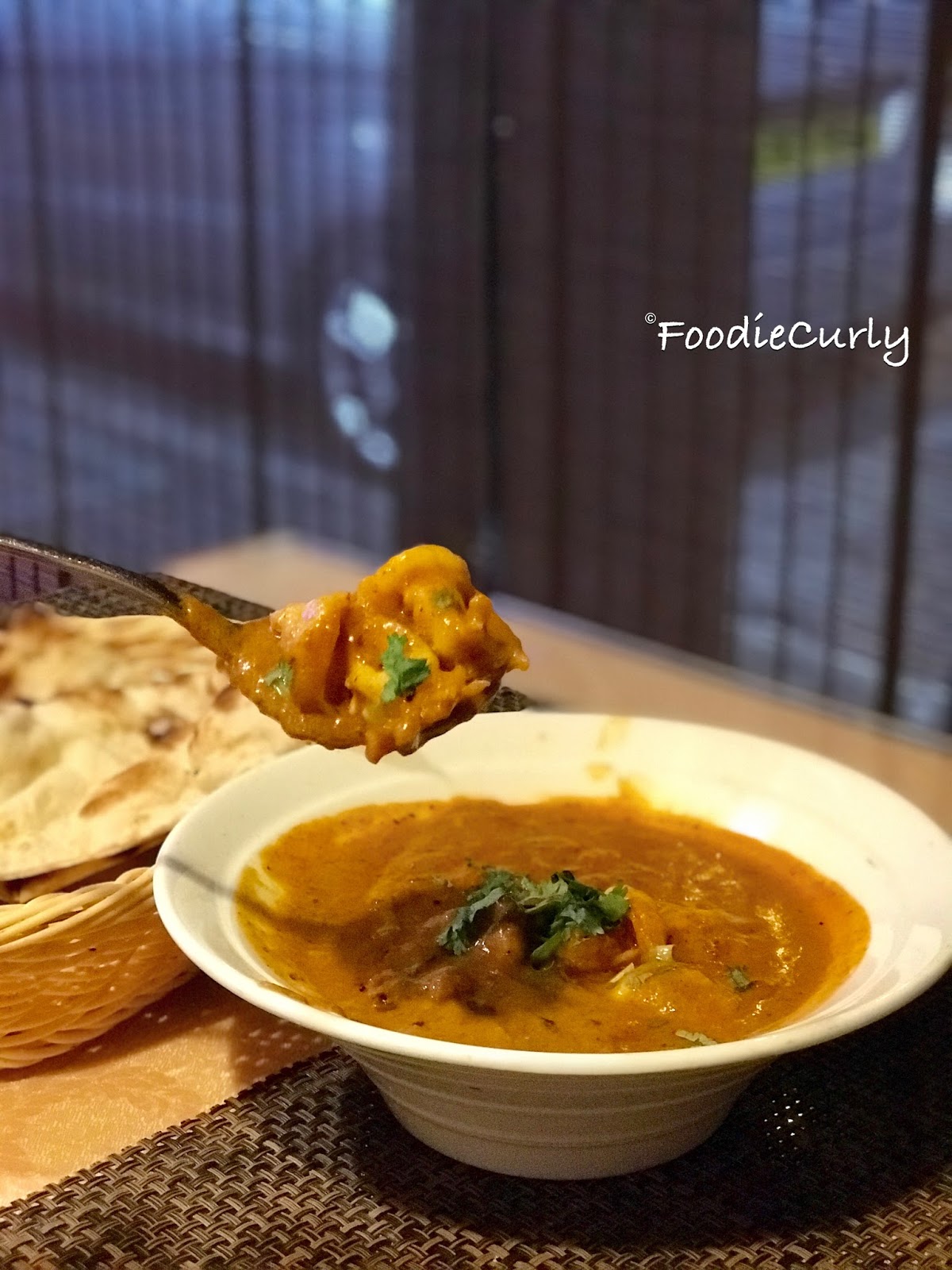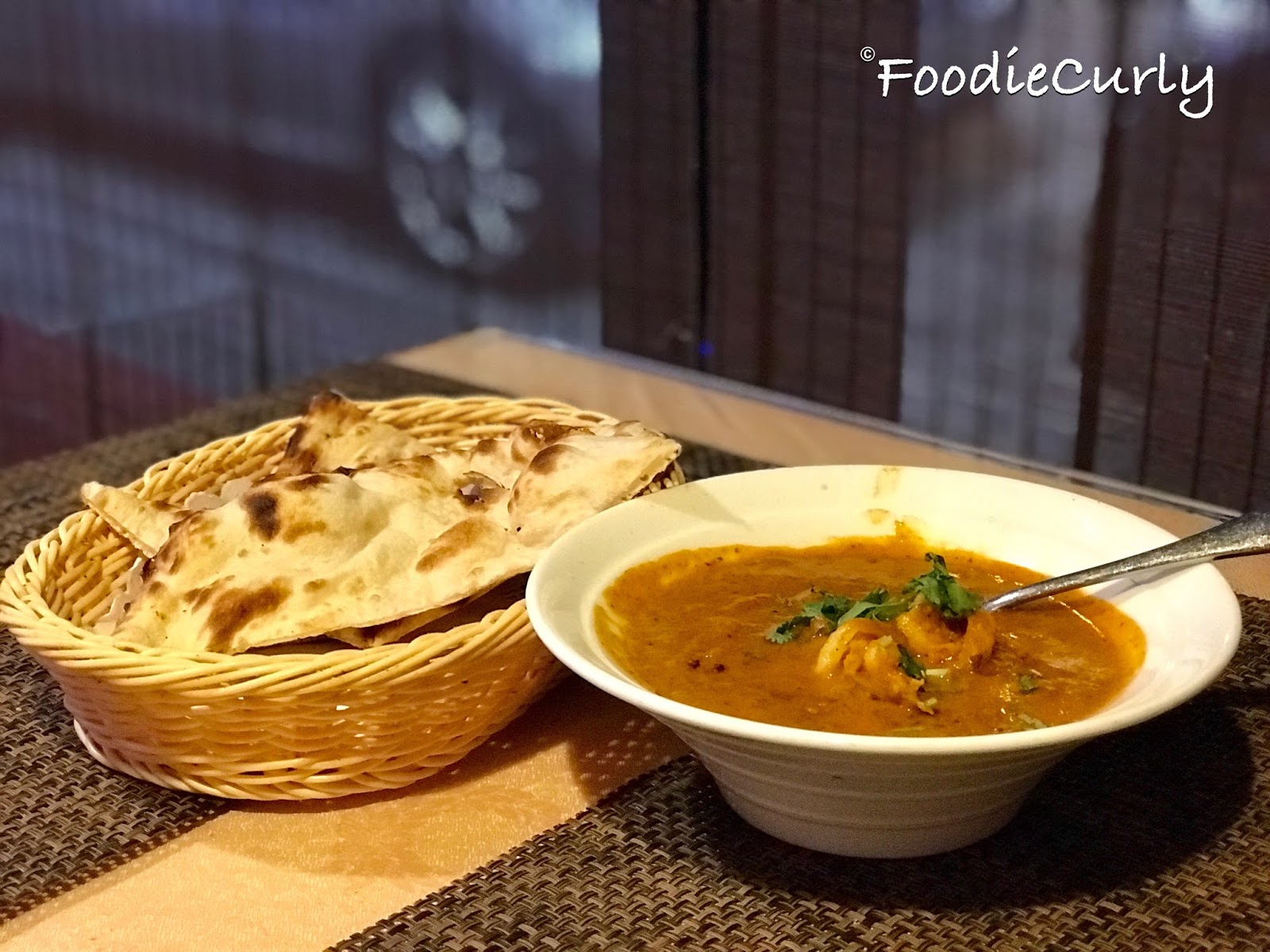 咖喱加了番茄,並不辛辣,反而是帶有獨特的甜味;蝦肉非常爽口,蝦味出眾,吃得出是新鮮蝦,整體感覺良好。吃咖喱時別忘了叫印度薄餅Naan,面層香脆裡面軟腍,有焦香,用來點咖喱汁吃一流。