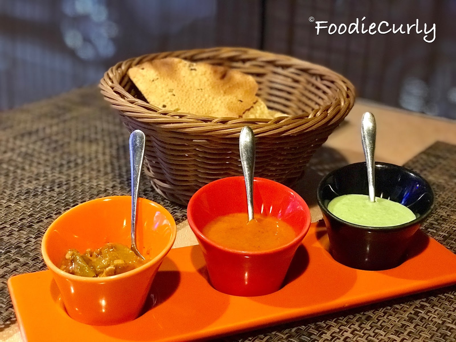 點餐之後,餐廳先送上免費的印度脆片Papad,特別的是,平時餐廳只會附以薄荷醬,但Curry Leaf則還有青辣椒醬和紅辣椒醬,前者可以見到大大塊的辣椒,吃一小口,又酸又辣,十分刺激,反而紅辣椒醬味道比較溫和,更得我歡心。